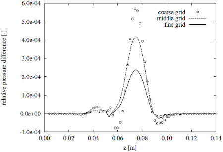 Relative difference of pressure between Smagorinsky and Spalart Allmaras turbulence model at t = 0.1 ms