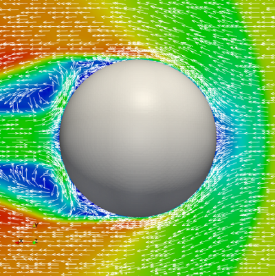 Contour plot of velocity magnitude of the three-dimensional case with unscaled velocity vectors at t = 26 μs