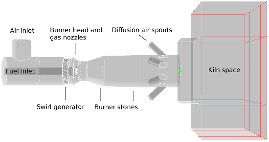 Overview of the implemented geometry. Left: Air-duct (from top) and gas supply (from left), middle: swirl-generator and gas distributor, mid-right: diffusion-air spouts and burner exit into kiln-space (big brick shaped volume on the far right).