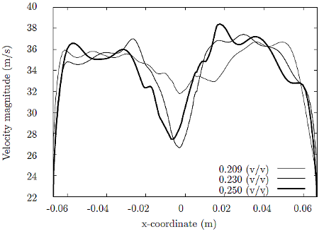 Simulation results of velocity magnitude (cell-center based values) for different oxygen concentrations in the oxidizer. Profiles are located at the diameter of the burner exit into the kiln-space.