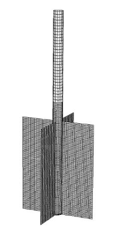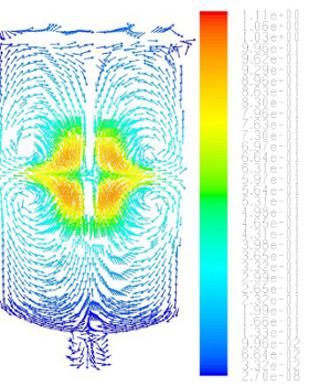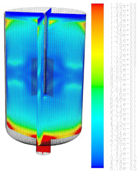 Picture 1 und 2: left side, mesh of the stirrer and the vessel, Picture 3: middle, vector-plot of the velocity field in the vessel at 250 rpm and non-Newtonian behaviour, Picture 4: right side, local depended viscosity in the vessel