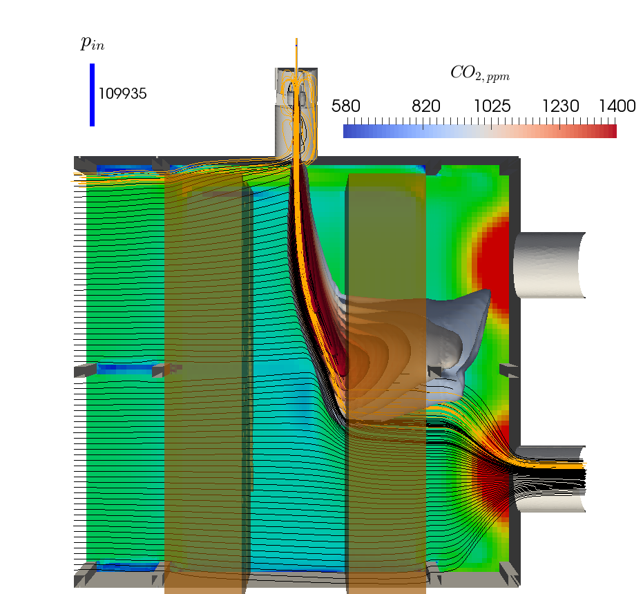 Simulated CO2 concentration and streamlines in the cold model.