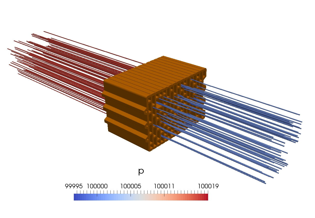 Streamlines showing the pressure distribution for the flow through a brick.