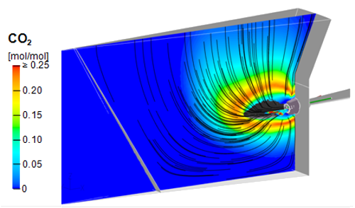 Carbon dioxide concentration profile, pathlines of blast flow and oil injection trajectories